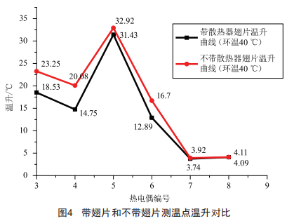 如圖4所示,散熱模塊帶翅片的散熱效果明顯優(yōu)于不帶散熱翅片的散熱效果,其中發(fā)熱元件位置溫差在5℃左右(3、4號傳感器)。說明熱管將發(fā)熱元件的熱量有效傳遞到了散熱元件外表面,增加外部翅片可以明顯降低發(fā)熱元件表面溫度。