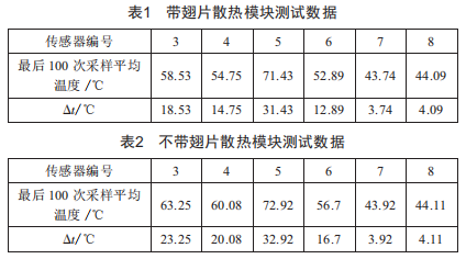 為了驗證散熱模塊翅片的效果,制定以下對比測試:在恒溫40℃的情況下,散熱模塊拆掉散熱風(fēng)扇,在散熱模塊上選取6個測溫點,分別對帶翅片散熱模塊和不帶翅片散熱模塊進行測溫。測量數(shù)據(jù)如表1、表2所示。