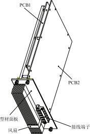 針對全封閉機箱,本文將介紹一種將散熱組件集成在模塊上的設(shè)計方法。圖1所示為PCB板安裝結(jié)構(gòu)示意圖。設(shè)計散熱翅片、導(dǎo)熱基板一體化的插件面板型材,在型材面板上固定PCB1和PCB2。PCB1上布置發(fā)熱元件,發(fā)熱元件通過導(dǎo)熱膜緊貼于型材面板。PCB2上布置風(fēng)扇連接器、控制電路以及其他設(shè)備功能電路。PCB1和PCB2之間采用板間連接器實現(xiàn)電路互聯(lián)。