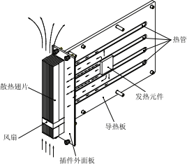 圖2所示為散熱組件熱量傳遞示意圖,圖示箭頭方向,展示了發(fā)熱元件熱量傳遞的路徑:發(fā)熱元件二導(dǎo)熱板二插件外面板上散熱翅片二外部空氣。具體實現(xiàn)方法:用導(dǎo)熱膜將插件上的發(fā)熱元件貼緊導(dǎo)熱板,將發(fā)熱元件熱量傳遞給導(dǎo)熱板:導(dǎo)熱板上嵌入若干熱管,熱管在嵌入方向上有很強的導(dǎo)熱能力,將發(fā)熱元件產(chǎn)生熱量大部分快速傳遞至插件外面板:在插件外面板的翅片內(nèi)嵌入風(fēng)扇,用強制風(fēng)冷方式,將插件外面板上的熱量散發(fā)到外部空氣中。