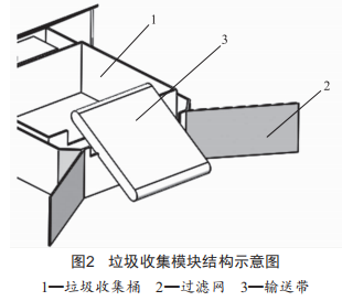垃圾收集模塊結(jié)構(gòu)示意圖如圖2所示,水面漂浮垃圾收集機器人艙體內(nèi)設(shè)置一個可拆卸垃圾收集桶,便于人工更換裝滿垃圾的垃圾收集桶,減少更換時間。垃圾收集桶內(nèi)表面光潔,上邊緣為圓角,便于垃圾清理。水面漂浮垃圾收集機器人前方兩側(cè)都設(shè)置有傾斜的過濾網(wǎng),將垃圾向機器人前方中心匯聚。機器人前方設(shè)置有一個傾斜的輸送帶機構(gòu),用于將機器人前方中心匯聚的垃圾輸送至垃圾收集桶。輸送帶機構(gòu)由鋁型材架、減速電機、同步帶、同步輪、上下端帶軸承的滾筒、平皮帶組成。輸送帶機構(gòu)中,蓄電池驅(qū)動減速電機旋轉(zhuǎn),減速電機通過帶傳動的方式帶動皮帶轉(zhuǎn)動,將垃圾輸送至垃圾收集桶。減速電機采用間斷式運轉(zhuǎn)的方式工作,節(jié)省電能。在垃圾收集桶上方設(shè)置一個光電傳感器于艙體側(cè)面,用于感應(yīng)垃圾收集桶是否裝滿垃圾,及時發(fā)送信號至清潔人員,清潔人員遙控水面漂浮垃圾收集機器人至垃圾場,并進行清理。這種垃圾收集方法收集效率高,運作穩(wěn)定,方便清潔人員處理垃圾。