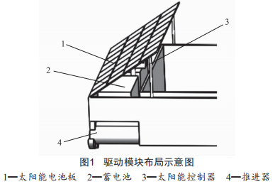由于水面漂浮垃圾收集機器人在水面上工作時能夠充分接收太陽光照,同時考慮到機器人頻繁的充電需求會嚴重影響其工作效率,因此使用光能作為驅(qū)動能源,驅(qū)動推進器工作,完成機器人在水面上的行駛功能。機器人的驅(qū)動模塊由推進器、太陽能電池板、蓄電池、太陽能控制器組成。