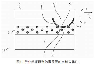 改進點:如圖4所示,覆蓋層2設(shè)置在接觸頭16和/或?qū)α⒂|頭元件15上:在電觸頭元件的材料方面,覆蓋層2是導電的,其暴露在空氣或包含氧氣的其他氣體中,由此,接觸表面4可在一段時間后被氧化,接觸表面4的被氧化的材料潛在地影響接觸表面4的傳導性,覆蓋層2可包括適于減少金屬氧化的化學還原劑,還原劑不被金屬吸收,所以能夠以局部濃度或液滴的形式嵌在覆蓋層2中。還原劑包括多質(zhì)子熔酸、線性熔酸、樹枝狀熔酸、分枝熔酸、松香酸、硬脂酸以及已二酸中至少一種熔接劑材料。