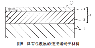 改進點:如圖5所示,連接器端子材料10在母材1的表面上具有包覆層4,包覆層4由銀層2和形成在銀層2上的潤滑層3構(gòu)成。銀層2由硬質(zhì)銀層或軟質(zhì)銀層構(gòu)成,潤滑層3是銀層2與含有硫醇和苯并三唑的溶液接觸而形成的。潤滑層3起到減少銀層2的表面的摩擦系數(shù)的作用。通過減少端子接點部的表面的摩擦系數(shù)而使端子接點部的耐磨損性提高。