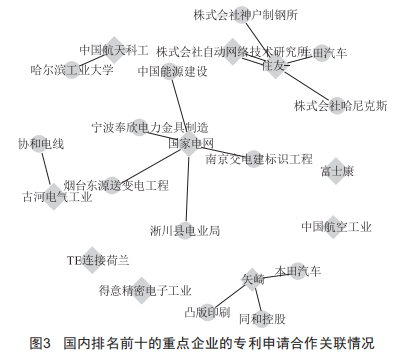 圖3為國內(nèi)排名前十的重點企業(yè)的專利申請合作關(guān)聯(lián)情況,可以看出,日本兩大連接器生產(chǎn)企業(yè)住友和矢崎在該領(lǐng)域均是聯(lián)合合作申請,國內(nèi)的國家電網(wǎng)已經(jīng)初步形成了一個以其為核心的研究群體,中國航天科工也和國內(nèi)高校開展了聯(lián)合研發(fā),其他的申請人在該領(lǐng)域則多為單兵作戰(zhàn)。建議國內(nèi)企業(yè)和科研院校在該領(lǐng)域加強合作研發(fā),形成更緊密的合作關(guān)系。