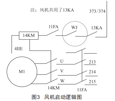 根據圖3所示的風機啟動邏輯圖,詳細檢查了接觸器14KM、中間繼電器13KA、斷路器11FA,沒有發(fā)現(xiàn)異常,由此判斷故障應為風機溫度繼電器"wJ"斷開導致。但該溫度繼電器為什么會斷開呢?通過測量APU對列供柜提供的輸出電壓發(fā)現(xiàn),UV相電壓190V,Uw相電壓210V,Vw相電壓380V。列供柜風機工作電壓存在三相不平衡現(xiàn)象,經過進一步檢查發(fā)現(xiàn),APU輸出接線U相端子松動,處理后故障現(xiàn)象消除。