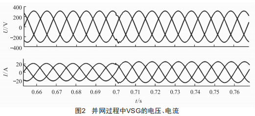 圖2為并網(wǎng)過程中的VSG電壓、電流波形,由圖可知,并網(wǎng)瞬間幾乎沒有產(chǎn)生沖擊電流,達到了所提控制策略的預期目標,驗證了本文理論的可行性。