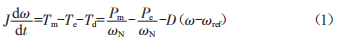 式中,J為同步發(fā)電機的轉動慣量:o為角速度,o=4:oref為電網(wǎng)同步角速度:Tm為機械轉矩:Te為電磁轉矩:Td為阻尼轉矩:D為阻尼系數(shù)。
