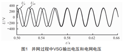 圖1為采用本文控制策略的并網(wǎng)仿真過程中,VSG輸出的電壓和大電網(wǎng)的電壓波形。0~0.50s孤島運行,在0.50s接收到并網(wǎng)信號,0.66s時完成并網(wǎng)過程,VSG和電網(wǎng)電壓達到一致,跟蹤效果好,響應速度快。