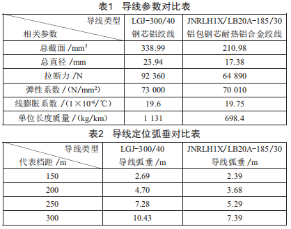 根據(jù)耐熱導(dǎo)線外徑計(jì)算結(jié)果,擬更換為JNRLH1x/LB20A-185/30鋁包鋼芯耐熱鋁合金絞線,與原導(dǎo)線的參數(shù)對比如表1所示。