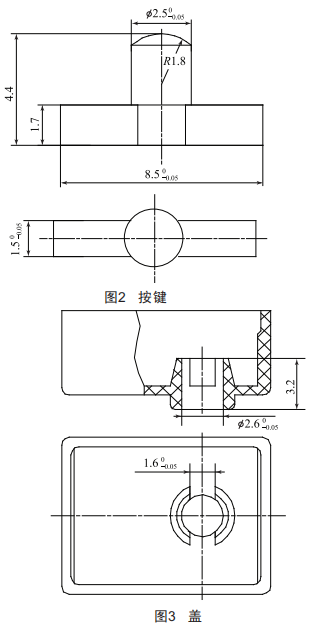 (2)蓋:增加導(dǎo)向長度,按鍵在蓋中活動由基本型的1.4mm的壁厚導(dǎo)向,改為3.2mm的中心導(dǎo)向,以防止按鍵在位移過程中出現(xiàn)偏載,影響兩刀動作的同步性(圖3)。