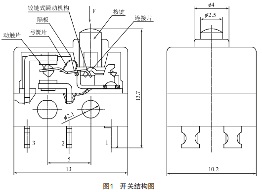 當按鍵受外力下壓位移時,兩個向下機構(gòu)中的連接片一并垂直下移,同時弓簧片受擠壓發(fā)生形變,儲存彈性勢能,當位移量達到開關(guān)換向點時,兩個動觸片同時跳躍,開關(guān)同時換向。當外力消除后,在弓簧片釋放彈性勢能,開關(guān)同時復(fù)位。