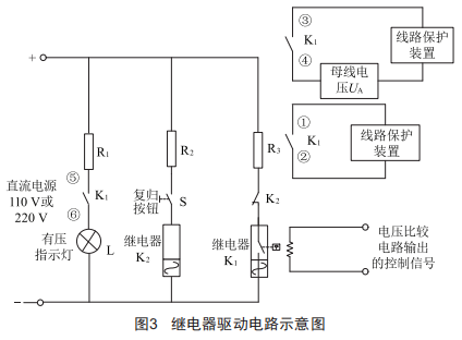 繼電器驅(qū)動(dòng)電路通過(guò)電壓比較電路的電源模塊取得供電電源,并受電壓比較電路的控制。電壓比較電路通過(guò)數(shù)據(jù)輸出模塊輸出數(shù)據(jù),并輸入到繼電器驅(qū)動(dòng)電路中,驅(qū)動(dòng)繼電器工作。驅(qū)動(dòng)器工作示意圖如圖3所示。當(dāng)線路有壓時(shí),電壓比較電路輸出有壓控制信號(hào),繼電器K1動(dòng)作,K1開(kāi)關(guān)閉合,有壓指示燈亮,顯示線路有壓,同時(shí)線路保護(hù)裝置檢測(cè)到線路有壓信號(hào):當(dāng)線路無(wú)壓時(shí),電壓比較電路無(wú)控制信號(hào)輸出,K1開(kāi)關(guān)斷開(kāi),有壓指示燈滅,顯示線路無(wú)壓,同時(shí)線路保護(hù)裝置檢測(cè)到線路無(wú)壓信號(hào)。圖中,R1、R2、R3為控制回路的相關(guān)保護(hù)元件(電阻、電感、電容),K2為復(fù)歸繼電器,s為復(fù)歸按鈕。