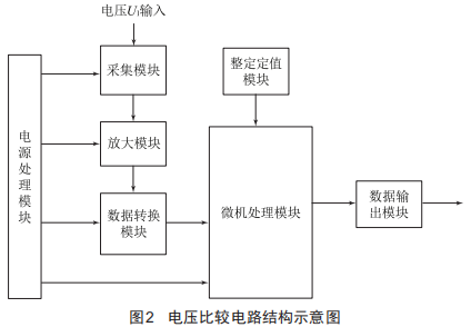 電壓比較電路包括電源處理模塊、采集模塊、放大模塊、數(shù)據(jù)轉(zhuǎn)換模塊、微機(jī)處理模塊、定值整定模塊以及數(shù)據(jù)輸出模塊,如圖2所示。