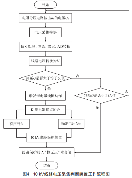 10kV線路電壓采集判斷裝置通過(guò)電阻分壓電路對(duì)線路電壓進(jìn)行分壓,并從分壓電阻Rb采集10kV線路電壓信號(hào)U1。由于U1功率小,不足以驅(qū)動(dòng)繼電器電路,并且不能直接進(jìn)行信號(hào)的A/D轉(zhuǎn)換,因此采樣的電壓信號(hào)還需輸入到電壓比較模塊。電壓比較模塊對(duì)采集信號(hào)進(jìn)行濾波、隔離、放大及A/D轉(zhuǎn)換后輸入到微機(jī)處理器,微處理器對(duì)采樣的線路電壓信號(hào)進(jìn)行邏輯判斷,當(dāng)采集電壓超過(guò)微機(jī)處理模塊整定的有壓值Uy(Uy取70%UN)時(shí),將通過(guò)數(shù)據(jù)輸出模塊輸出信號(hào)控制繼電器K1開(kāi)關(guān)動(dòng)作。此時(shí)繼電器K1常開(kāi)的3對(duì)接點(diǎn)①/②、③/④、⑤/⑥均閉合,其中①/②接點(diǎn)閉合引至10kV線路保護(hù)的保護(hù)開(kāi)入模塊,作為"線路有壓"的開(kāi)入功能:③/④接點(diǎn)閉合串聯(lián)10kV母線二次電壓UA,輸入到10kV線路保護(hù)裝置的采樣模塊UxL,作為線路的采集電壓:⑤/⑥接點(diǎn)閉合時(shí),線路有壓帶電指示燈點(diǎn)亮,完成線路有壓檢測(cè)。因此,當(dāng)線路處于正常運(yùn)行狀態(tài)時(shí),線路電壓采集判斷裝置一直處于有壓工作狀態(tài),有壓指示燈常亮,保護(hù)裝置一直檢測(cè)線路有壓。當(dāng)采集的線路電壓低于微機(jī)處理模塊整定的有壓值Uw(Uw取30%UN)時(shí),數(shù)據(jù)輸出模塊將無(wú)控制信號(hào)輸出,繼電器K1開(kāi)關(guān)不動(dòng)作,繼電器K1的3對(duì)常開(kāi)接點(diǎn)斷開(kāi),保護(hù)裝置將檢測(cè)到10kV線路無(wú)壓,此時(shí)若重合閘裝置投入工作,保護(hù)裝置將進(jìn)行檢無(wú)壓重合閘,其工作流程圖如圖4所示。
