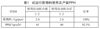 雖然在PG工藝流程中升級使用了全自動涂膠設備,產(chǎn)品玻璃覆蓋不良率已經(jīng)得到了很大的改善,但由于公司工藝情況及實際應用,很多自動設備廠商沒有生產(chǎn)過類似的預浸潤滴液系統(tǒng),只提供了購買此類機臺客戶的使用方法——通過增加滴膠量和改變滴膠方式來彌補玻璃氣孔的缺陷,這樣給我們公司帶來的問題就是原物料的浪費及產(chǎn)能PPH的下降(表1)。