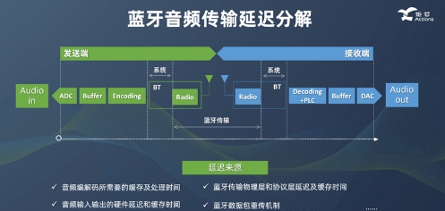 周正宇博士指出,藍(lán)牙音頻傳輸延遲來(lái)源主要有幾個(gè)。一是所有硬件本身所帶來(lái)的音頻延遲,比如說(shuō)ADC、DAC所帶來(lái)的延遲;二是無(wú)線傳輸本身的發(fā)射和接受端帶來(lái)的延遲;三是為了增強(qiáng)抗干擾使用的重傳機(jī)制帶來(lái)的延遲;最重要的是無(wú)線音頻傳輸?shù)膸捪拗?,?dǎo)致音頻一定要做壓縮和解壓縮,不同的壓縮算法會(huì)引入壓縮和解壓縮所帶來(lái)的延遲;以及實(shí)現(xiàn)以上各技術(shù)功能需要的緩存機(jī)制。