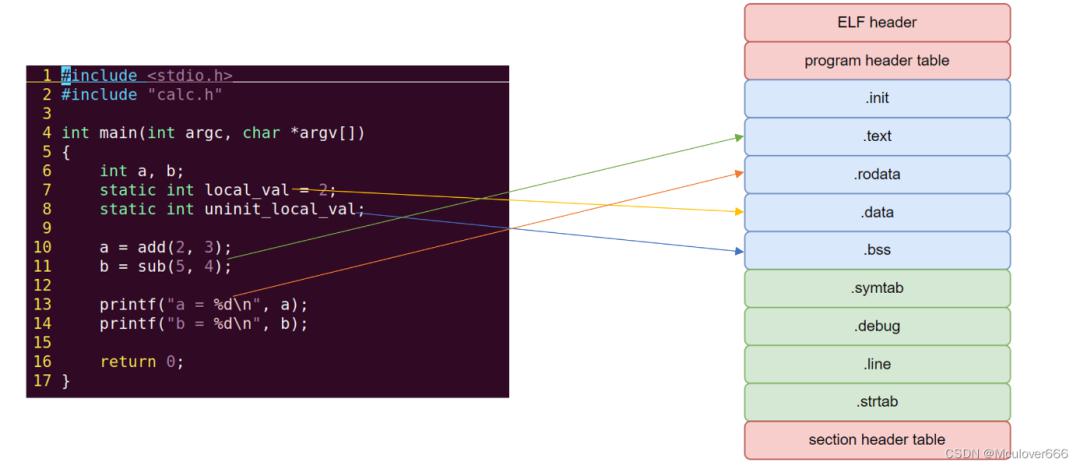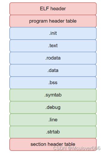 一個(gè)可執(zhí)行文件由一系列 section 構(gòu)成,section 稱為段,包括:代碼段 text、只讀數(shù)據(jù)段 rodata、數(shù)據(jù)段 data、bss 段等。
