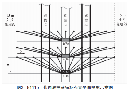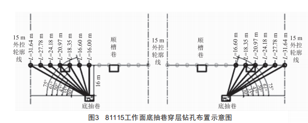 (1)81115工作面底抽巷"以巖保煤"穿層鉆孔按照5m×~ m(傾向×走向)布置 ,在81115工作面底抽巷內(nèi)施工。