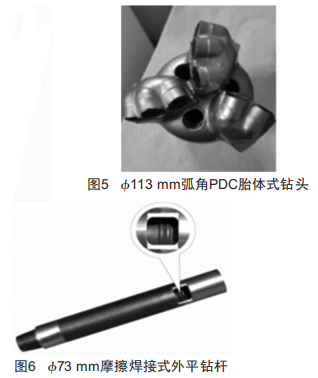 配套用鉆頭為小113mm三翼弧角拋物線PDC胎體式鉆頭 ,鉆桿為小73mm摩擦焊接式外平鉆桿 ,實(shí)物如圖5、圖6所示。