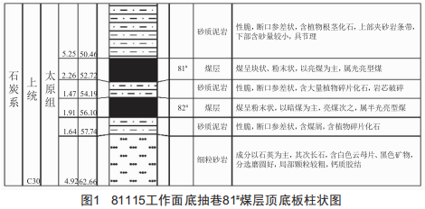 81115工作面總體形態(tài)簡(jiǎn)單,為北高南低的單斜構(gòu)造,81#煤層傾角界于29+109之間,平均為~9。直接頂為砂質(zhì)泥巖,厚度為5.25m:直接底為泥巖、82#,厚度為3.38m:老頂為細(xì)粒砂巖,厚度為2.315m:老底為砂質(zhì)泥巖,厚度為1.~4m,具體如圖1所示。