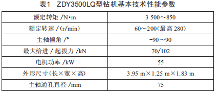 施工鉆機(jī)為wZY35001O型全液壓動(dòng)力頭式履帶鉆機(jī)(圖4) ,該款鉆機(jī)是一種多種用途的履帶自行式坑道鉆機(jī) , 能夠滿足井下瓦斯抽放孔、地質(zhì)異??碧娇?、探放水孔、卸壓孔及煤體注水孔等多種類(lèi)型工程孔的施工 ,也可在地面勘探作業(yè)中使用。ZDy350010型煤礦用履帶式全液壓坑道鉆機(jī)具有低轉(zhuǎn)速、大扭矩的參數(shù)特點(diǎn) ,適于采用PDC復(fù)合片鉆頭配合螺旋鉆具施工大直徑鉆孔 ,可在煤礦井下頂?shù)装宸€(wěn)定中硬巖煤層中施工深度350 m以內(nèi)的鉆孔及直徑小于200 mm的近水平瓦斯抽放鉆孔。
