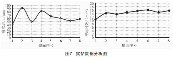由實(shí)鉆數(shù)據(jù)(圖7)可知:單個(gè)扇面最高進(jìn)尺283 m、最多鉆孔13個(gè) : 單班最高進(jìn)尺92 m 、平均進(jìn)尺62 . 2 m : 最高時(shí)效19 . 2 m/h ,平均時(shí)效14.35m/h。與常規(guī)鉆機(jī)(礦方原來(lái)使用ZDy-3200型鉆機(jī))相比 ,節(jié)省了大量的施工輔助時(shí)間 ,提高了成孔效率:且極大地降低了施工人員的勞動(dòng)強(qiáng)度 ,增加了鉆進(jìn)效率 , 同時(shí)提高了經(jīng)濟(jì)效益。