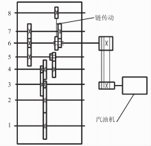 培土機選用汽油機作為動力源,汽油機與減速器之間采用帶傳動。如圖1所示,培土機部分采用鏈傳動,行走輪部分采用齒輪傳動,設(shè)有兩級轉(zhuǎn)速,并設(shè)置倒擋跟空擋,通過兩連滑移齒輪調(diào)整傳動比控制輸出軸最終轉(zhuǎn)速,進而實現(xiàn)不同的行進速度。