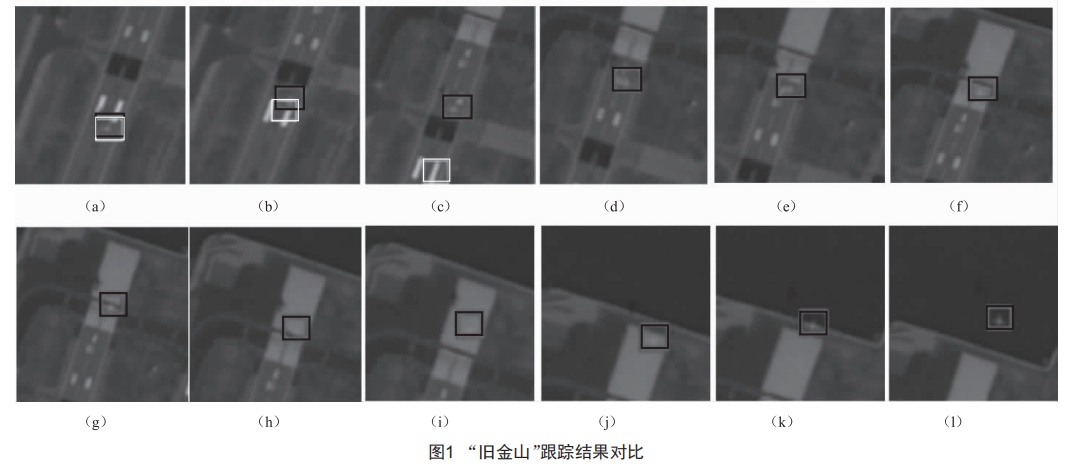 圖1對比了本文算法和STC算法"舊金山"視頻序列中飛行器進(jìn)行目標(biāo)跟蹤實(shí)驗(yàn)結(jié)果,其中白色細(xì)框?yàn)镾TC算法跟蹤結(jié)果,黑色粗框?yàn)楸疚乃惴ǜ櫧Y(jié)果。可以看出,測試視頻序列中背景與目標(biāo)的圖像特性相似度極高,人眼已難以從背景中提取出目標(biāo),跟蹤難度極大。在目標(biāo)經(jīng)過跑道背景中的白塊時(shí),由于背景信息對目標(biāo)造成的極大干擾,STC算法在尋找目標(biāo)時(shí)出現(xiàn)錯(cuò)誤,真實(shí)目標(biāo)的響應(yīng)峰值并不是其最大值,進(jìn)而導(dǎo)致跟蹤失敗。