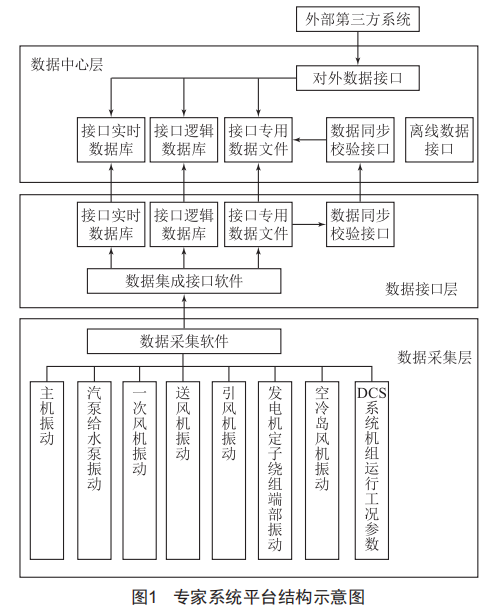 專家系統(tǒng)平臺監(jiān)測對象包括汽輪發(fā)電機組、汽泵給水泵組、引風(fēng)機組、送風(fēng)機組、一次風(fēng)機組和空冷島風(fēng)機組等旋轉(zhuǎn)設(shè)備的相關(guān)工況參數(shù)。專家系統(tǒng)平臺由數(shù)據(jù)采集層、數(shù)據(jù)集成接口層和數(shù)據(jù)中心層三部分構(gòu)成,用以實現(xiàn)數(shù)據(jù)采集、數(shù)據(jù)傳輸、數(shù)據(jù)接收、數(shù)據(jù)存儲、數(shù)據(jù)發(fā)布和數(shù)據(jù)對外接口等功能,其結(jié)構(gòu)示意圖如圖1所示。
