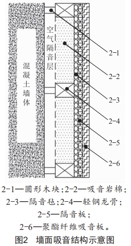 在距墻體表面30~50mm處釘制輕鋼龍骨框架,各釘制點(diǎn)背襯30~50mm高的圓形木塊,之所以在墻面和龍骨間預(yù)留一定距離的空氣層,就是要避免墻體和龍骨直接接觸后形成"聲橋",降低吸音效果。龍骨與支撐地面、隔音板間加墊一層厚度3mm的隔音氈,間隙部分用隔音密封劑填充。龍骨中間滿鋪一層總厚度不小于75mm的吸音巖棉,隔音板表面貼敷的吸音材料可根據(jù)客戶意見(jiàn)選擇聚酯纖維吸音板、穿孔吸音板、布藝吸音板、木絲吸音板等其中的一種。推薦采用聚酯纖維吸音板,價(jià)格低且吸音效果好。這是靶場(chǎng)墻面的通常設(shè)計(jì),但在實(shí)際施工時(shí)往往因個(gè)別靶場(chǎng)寬度尺寸受限,無(wú)足夠空間預(yù)留空氣吸音層,可不設(shè)置,但吸音巖棉總厚度應(yīng)不小于90mm,相應(yīng)龍骨也要選擇大一號(hào)規(guī)格。墻面吸音結(jié)構(gòu)安裝示意圖如圖2所示。