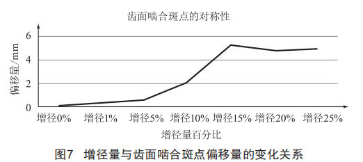 分析:以蝸輪中間平面作為測量參考基準面,隨著增徑量的增加,蝸輪齒面嚙合斑點與蝸輪齒面中間平面的偏移量逐漸增加,蝸輪齒面嚙合斑點的位置由對稱逐漸向不對稱變化,