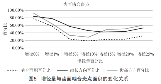 1)齒面嚙合斑點的面積大小:嚙合斑點以嚙合面積大小、形狀和分布位置表示。嚙合面積大小按嚙合痕跡的百分比計算確定,其中以沿齒長方向與沿齒高方向來衡量齒面嚙合斑點的面積大小,變化規(guī)律如圖5所示。
