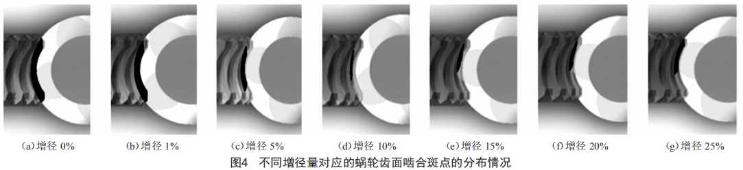 (2)不同增徑量的蝸輪滾刀加工的蝸輪齒面嚙合斑點的變化情況。