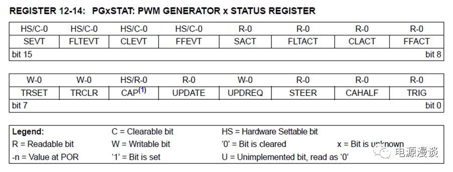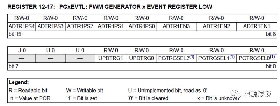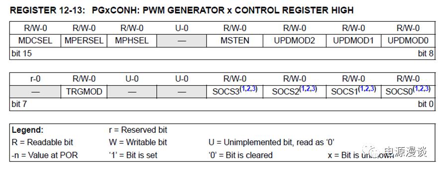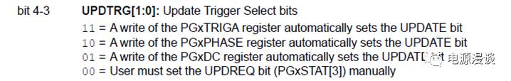 PGxDC是通常使用的寄存器更新的觸發(fā)方式,一旦寫入PGxDC寄存器值就認(rèn)為PWM模塊設(shè)置了更新命令。在變相位應(yīng)用中,可以使用PGxTRIGA,PGxPHASE等進(jìn)行觸發(fā)更新設(shè)置。值得注意的是,這里被選擇作為觸發(fā)更新的寄存器一定要是最后一個(gè)更新的寄存器,更新了這個(gè)寄存器就認(rèn)為所有寄存器都進(jìn)行了值的更改。