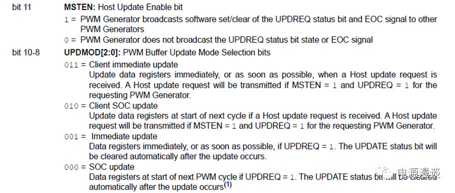 dsPIC33CH/dsPIC33CK中允許不同的PWM產(chǎn)生同步更新數(shù)據(jù)BUFFER寄存器,具體而言,采用對MSTEN bit進(jìn)行設(shè)置,MSTEN設(shè)置為1,則允許當(dāng)前PWM產(chǎn)生器對其它PWM產(chǎn)生器進(jìn)行廣播更新要求及SOC信號,其UPDREQ和UPDATE bit可以廣播給其它的PWM產(chǎn)生器。