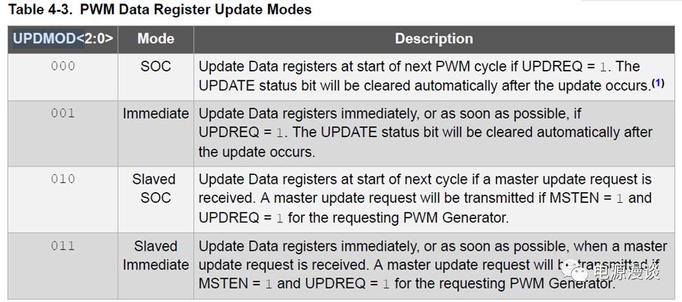 如果其它的PWM產(chǎn)生器,也設(shè)置為了合適的接收模式,可參考圖7所示表格,那么一旦它接收到了主PWM產(chǎn)生的更新信號,則它會將Local 自己PWM產(chǎn)生器的UPDREQ位設(shè)置為1,UPDATE位也會變?yōu)?/span>1.當(dāng)Local PWM產(chǎn)生器進(jìn)行了更新之后,UPDATE位自動(dòng)被硬件清零。