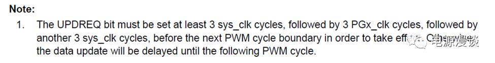 在圖8所示的更新模式中,一個(gè)值得注意的地方,我們放在圖9所示,針對SOC更新,UPDREQ的置位時(shí)刻需要和下一個(gè)PWM周期的邊界保持一定的時(shí)間間隔,這樣才能使得更新生效,否則數(shù)據(jù)更新將會被delay到接下來的一個(gè)PWM周期中。