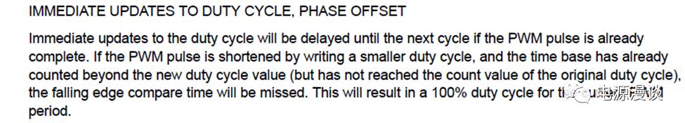 對占空比的立即更新,有兩種情況需要說明。一種情況是,更新命令發(fā)生時(shí),PWM脈沖寬度已經(jīng)結(jié)束,那么這個(gè)立即更新會延時(shí)到下一個(gè)周期生效。