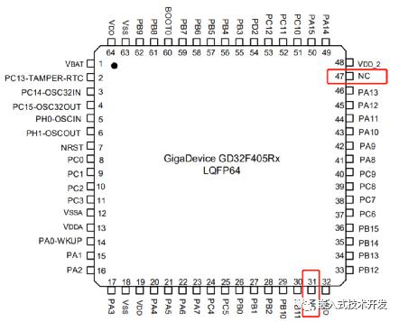 1.硬件我用的單片機(jī)型號(hào)為GD32F405RGT6,對應(yīng)STM32F405RGT6。首先,硬件上基本兼容,有一點(diǎn)不同的是GD32的31和47腳為NC,STM32的為VCAP。STM32這兩個(gè)引腳需要分別連接一個(gè)電容到GND,而GD32則不需要。當(dāng)然,有這兩個(gè)電容也無所謂,所以,硬件上GD32可以直接替換STM32。