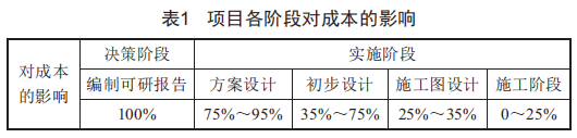 根據(jù)工程項(xiàng)目全生命周期理論,工程項(xiàng)目通常分為決策階段、實(shí)施階段和使用階段。從統(tǒng)計(jì)來看,對(duì)于總承包商來說,設(shè)計(jì)階段對(duì)成本的影響至關(guān)重要,如表1所示。