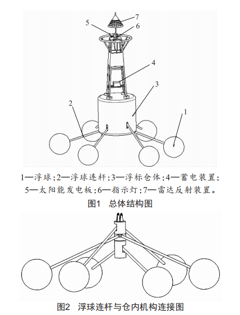 自發(fā)電式海上燈浮標的整體結構如下:該裝置由浮球、浮球連桿、浮標倉體、蓄電裝置、太陽能發(fā)電板、指示燈以及雷達反射裝置組成。如圖1所示,每隔60°設置一個浮球,共設置六個浮球,兩兩一組在同一條直線上。浮球通過連桿與浮標倉體內的空間固定圓柱相連,浮球連桿與浮標倉體接觸處設置槽口,浮標倉體下底有微小的錐度,中心留有一小孔,如大浪將水帶入浮標倉體內部可以短時間將水排出。浮標倉體上方固定著上體支架,蓄電裝置放置在支架體中下方位置,通過兩條橫向支撐板固定,支架上方設置太陽能發(fā)電板、指示燈以及雷達反射裝置。浮標倉體底部通過錨固定的方式控制浮標所能移動的范圍。