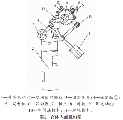 如圖3所示,倉體內部涵蓋了升降機構、空間固定圓柱、棘輪機構、電機及聯(lián)軸器等構件。其中升降機構與浮球連桿固接,升降桿連接著固定軸①,固定軸①通過兩端固定圓盤與浮標倉體本身固接,升降機構上方連著兩根中間連桿,連桿與棘輪機構相連接,棘輪機構與固定軸②相連接,固定軸③通過聯(lián)軸器與發(fā)電機相連。