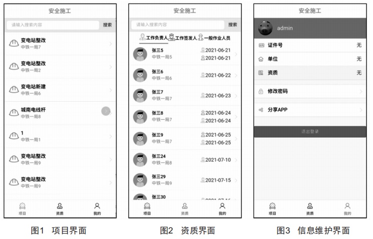 如圖1~3所示,圖1是項(xiàng)目,用于顯視施工單位名稱,點(diǎn)進(jìn)去有單位人員的具體信息:圖2是資質(zhì),有查詢欄,可以按名字快速搜索施工單位信息和資質(zhì):圖3是登錄人員信息維護(hù)界面。