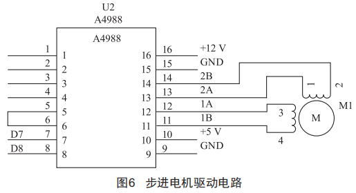 本文采用A4988步進電機驅(qū)動芯片,該芯片驅(qū)動42步進電機時只占兩個I/O口,控制方便,其中6腳為脈沖數(shù)控制引腳,控制電機轉(zhuǎn)動的角度,8腳為步進電機正反轉(zhuǎn)控制引腳。