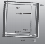 本垃圾桶需要在開門傾倒垃圾前將垃圾封裝打包,打包機構(gòu)設(shè)計采用螺旋傳動,通過螺桿轉(zhuǎn)動帶動螺母桿作直線移動。如圖3所示,打包機構(gòu)右方槽中安裝有電熱絲,兩連接桿前端綁有熱膠帶,起輔助加熱作用。打包時,圖中下方電機轉(zhuǎn)動,帶動螺桿轉(zhuǎn)動從而驅(qū)動螺母桿將垃圾袋擠壓到下方位置:而后圖中右方電機轉(zhuǎn)動,通過螺旋傳動將垃圾袋拘束到右側(cè)的狹小區(qū)域,電熱絲通電同時熱量傳遞到桿上熱膠帶,將垃圾袋局部熔融形成結(jié)節(jié),垃圾袋打包完成。