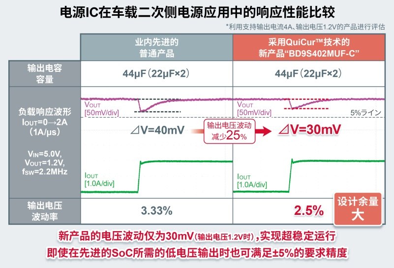 新產(chǎn)品滿足性能日益提升的SoC(System on a Chip)和微控制器的二次側(cè)*2電源應(yīng)用所需求的小尺寸、4A輸出電流、開關(guān)工作頻率2MHz以上以及0.6V低壓輸出。而且,通過搭載ROHM自有的高速負(fù)載響應(yīng)*3技術(shù)“QuiCur”,與同等功能的普通產(chǎn)品相比,輸出電壓波動(dòng)降低25%,僅為30mV,實(shí)現(xiàn)超穩(wěn)定運(yùn)行(測試條件:輸出電壓1.2V,輸出電容容量44μF,負(fù)載電流波動(dòng)0→2A/2μ秒),這使其非常適用于電源條件嚴(yán)苛(在低電壓輸出條件下也要確保在±5%以內(nèi)穩(wěn)定運(yùn)行)的高端ADAS應(yīng)用。