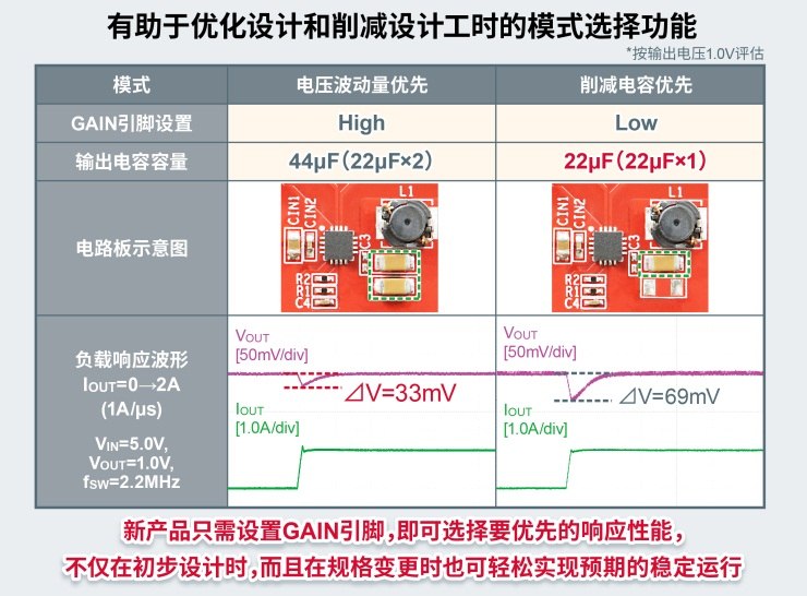 此外,作為新功能還內(nèi)置了響應(yīng)性能選擇功能,可通過引腳設(shè)置在“電壓波動(dòng)量優(yōu)先(業(yè)內(nèi)超穩(wěn)定運(yùn)行)”、“削減電容優(yōu)先(22μF小容量穩(wěn)定運(yùn)行)”之間輕松切換。不僅在初步設(shè)計(jì)時(shí),而且在規(guī)格或型號變更時(shí),都可以輕松實(shí)現(xiàn)預(yù)期的穩(wěn)定運(yùn)行,因此,有助于顯著減少電源電路設(shè)計(jì)工時(shí)。