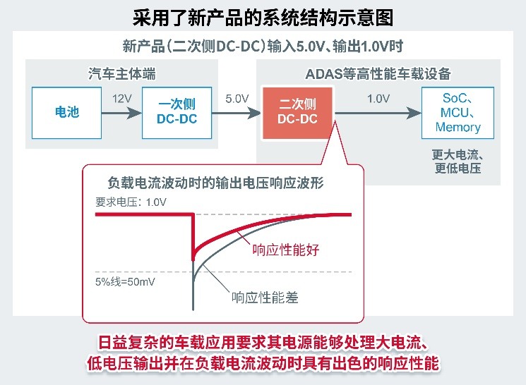 另外,還采用新確立的高速負(fù)載響應(yīng)技術(shù)“QuiCur?”,實(shí)現(xiàn)了非常出色的穩(wěn)定運(yùn)行(負(fù)載響應(yīng)特性)。即使在1.0V以下的低電壓輸出條件下或負(fù)載電流波動(dòng)時(shí),也可以將電壓波動(dòng)抑制在±5%以內(nèi),因此非常適用于高端ADAS的二次側(cè)電源。