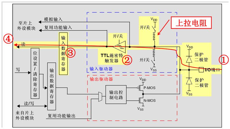 上拉輸入模式下,I/O端口的電平信號直接進(jìn)入輸入數(shù)據(jù)寄存器。但是在I/O端口懸空(在無信號輸入)的情況下,輸入端的電平保持在高電平(并且在I/O端口輸入為低電平的時(shí)候,輸入端的電平也是低電平)